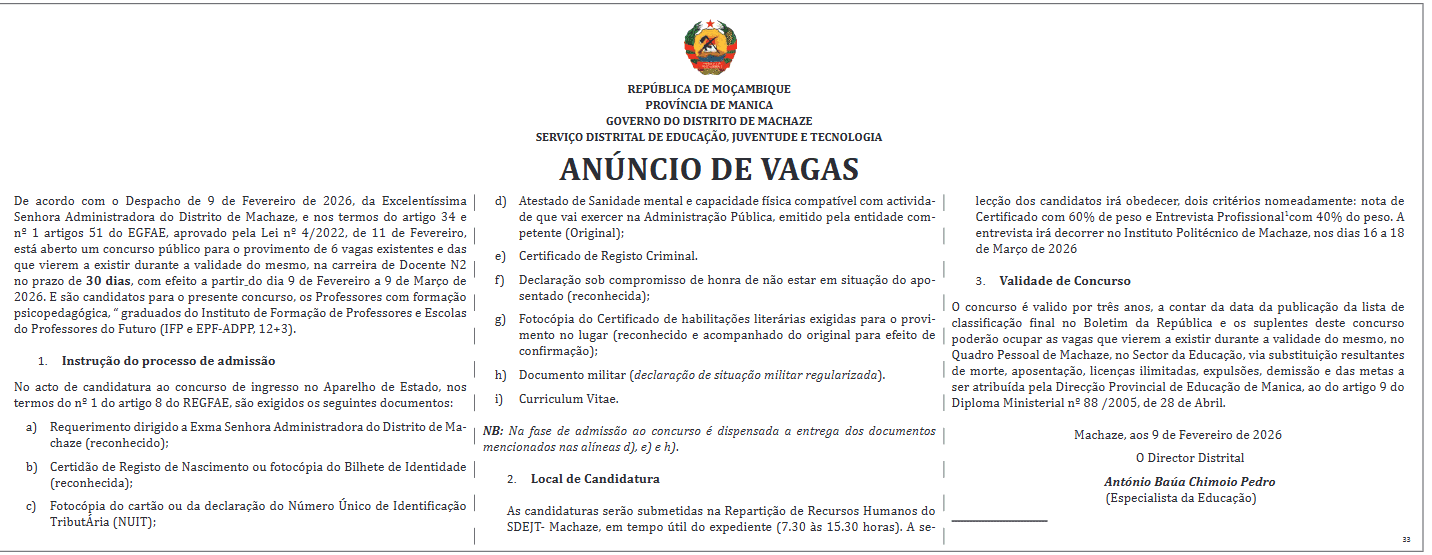 De acordo com o Despacho de 9 de Fevereiro de 2026, da Excelentíssima Senhora Administradora do Distrito de Machaze, e nos termos do artigo 34 e nº 1 artigos 51 do EGFAE, aprovado pela Lei nº 4/2022, de 11 de Fevereiro, está aberto um concurso público para o provimento de 6 vagas existentes e das que vierem a existir durante a validade do mesmo, na carreira de Docente N2 no prazo de 30 dias, com efeito a partir do dia 9 de Fevereiro a 9 de Março de 2026. E são candidatos para o presente concurso, os Professores com formação psicopedagógica, ” graduados do Instituto de Formação de Professores e Escolas do Professores do Futuro (IFP e EPF-ADPP, 12+3).