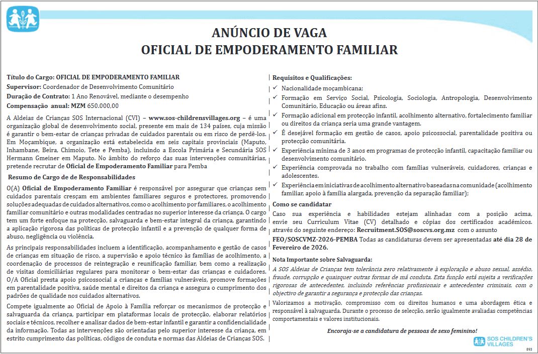 A Aldeias de Crianças SOS Internacional (CVI) – www.sos-childrensvillages.org – e uma organização global de desenvolvimento social, presente em mais de 134 países, cuja missão é garantir o bem-estar de crianças privadas de cuidados parentais ou em risco de perde-los. Em Moçambique, a organização está estabelecida em seis capitais provinciais (Maputo, Inhambane, Beira, Chimoio, Tete e Pemba), incluindo a Escola Primaria e Secundaria SOS I v Hermann Gmeiner em Maputo. No âmbito do reforço das suas intervenções comunitárias, pretende recrutar de Oficial de Empoderamento Familiar para Pemba.