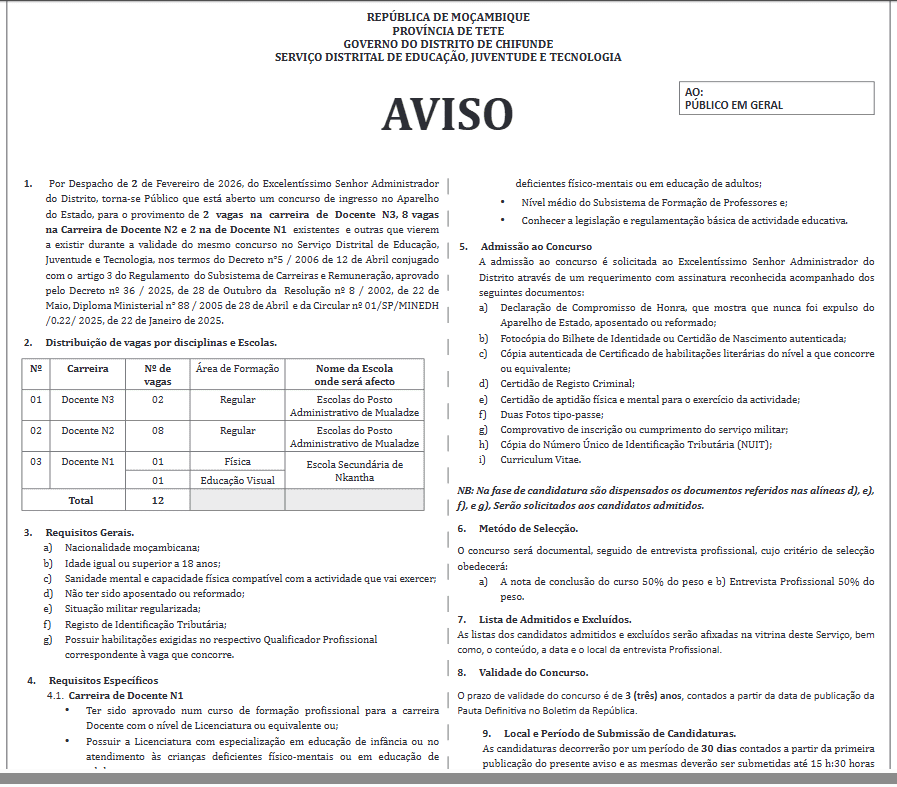 Por Despacho de 2 de Fevereiro de 2026, do Excelentíssimo Senhor Administrador do Distrito, torna-se Publico que esta aberto um concurso de ingresso no Aparelho do Estado, para o provimento de 2 vagas na carreira de Docente N3, 8 vagas na Carreira de Docente N2 e 2 na de Docente N1 existentes e outras que vierem a existir durante a validade do mesmo concurso no Serviço Distrital de Educação, Juventude e Tecnologia, nos termos do Decreto n°5 / 2006 de 12 de Abril conjugado com o artigo 3 do Regulamento do Subsistema de Carreiras e Remuneração, aprovado pelo Decreto nº 36 / 2025, de 28 de Outubro da Resolução nº 8 / 2002, de 22 de Maio, Diploma Ministerial n° 88 / 2005 de 28 de Abril e da Circular nº 01/SP/MINEDH /0.22/ 2025, de 22 de Janeiro de 2025.