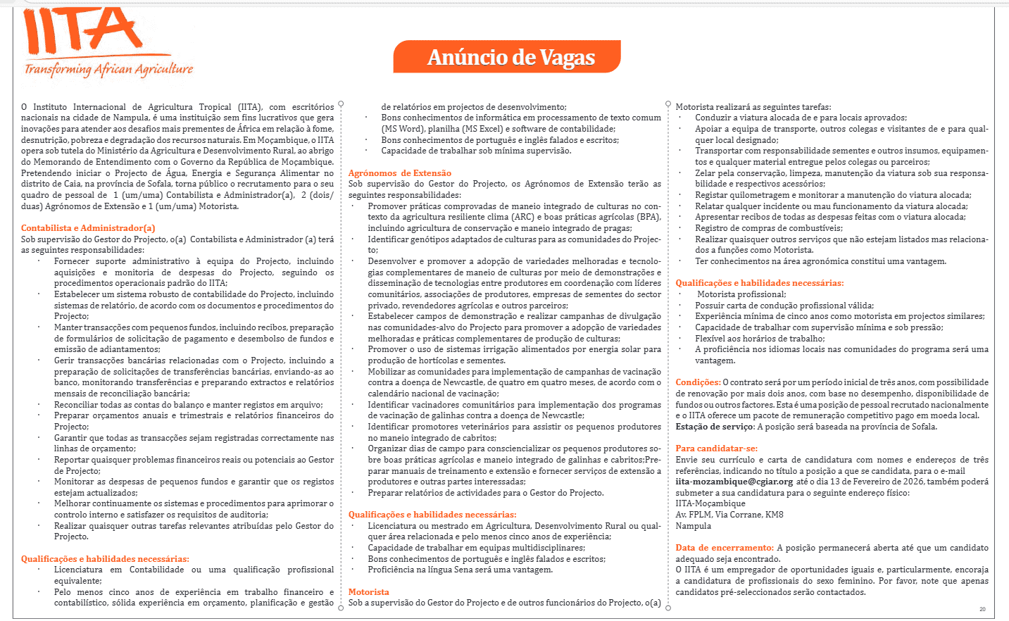 Envie seu currículo e carta de candidatura com nomes e endereços de três referencias, indicando no titulo a posição a que se candidata, para o e-mail: iita-mozambique@cgiar.org, ate o dia 13 de Fevereiro de 2026, também poderá submeter a sua candidatura para o seguinte endereço físico: